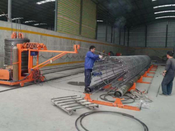 3、機器上骨架制作過(guò)程;備齊一節鋼筋籠所需箍筋按位置平放兩輥輪上,將一根主筋抬放于輥輪長(cháng)度上方,調整好起始尺寸,豎直箍筋,主筋靠著(zhù)箍筋單面施焊,待主筋轉至上方再補焊。焊完一節主、箍筋,低速轉動(dòng)膠輥,抬二根主筋準備焊接。此時(shí)按選定生產(chǎn)工藝確定旋轉方向,采用卡具(比子)制作骨架時(shí),待二根主筋或多根主筋焊完后,主筋下行。若采用掛鉤工藝則反向旋轉,應注意多根主筋焊好后有可能出現偏重,可將骨架旋轉在對面位置或錯開(kāi)幾根位置后再開(kāi)始分度焊接,后補齊焊完全部主筋。